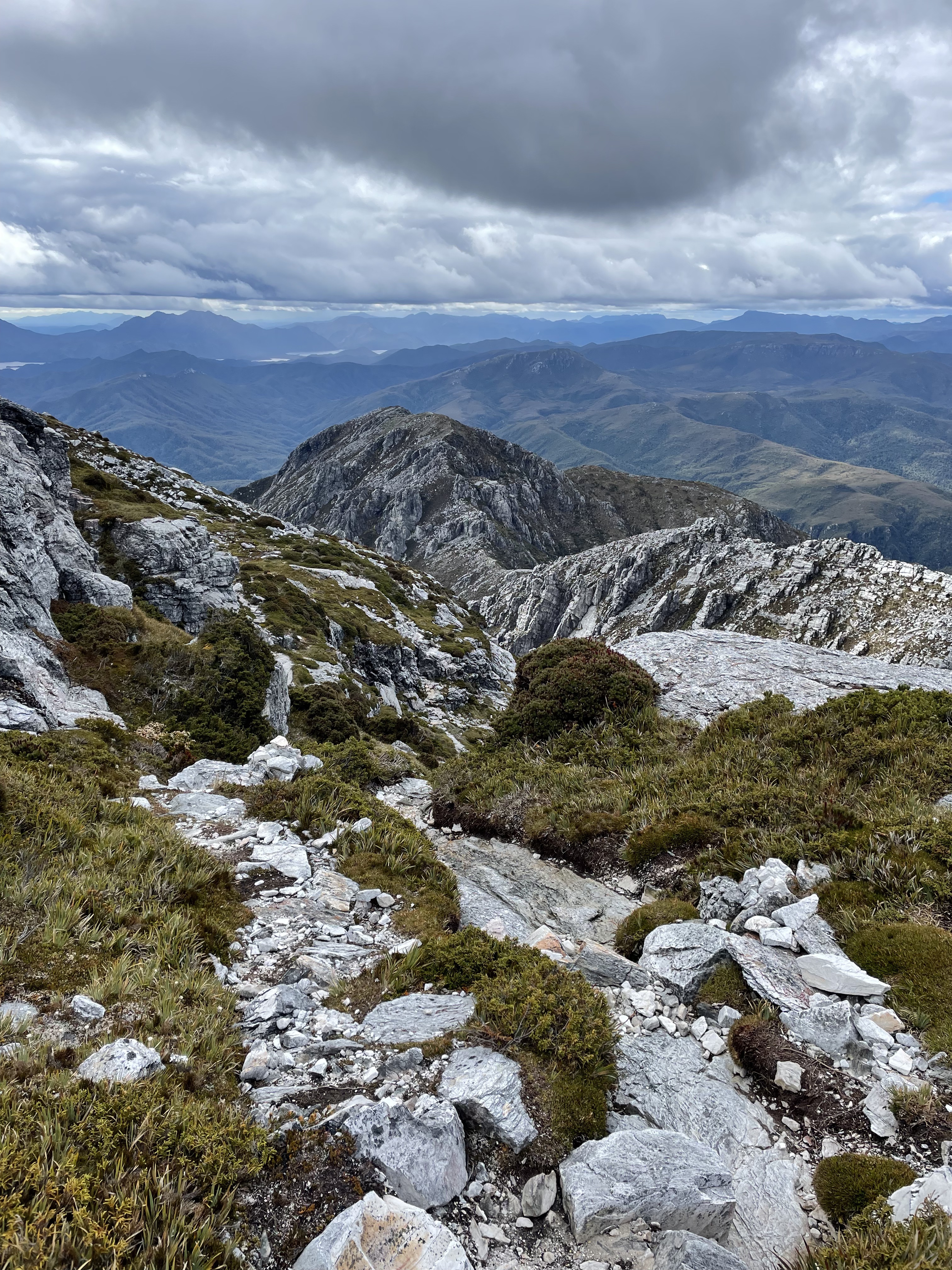 A return trip of 46km doesn’t sound that daunting and the 10km introduction along the gentle slopes and button grass plains put me at ease. We crossed the Franklin River and Lodden River via suspension bridges and for a while I questioned the 3-5 day suggested time frame on the sign. After Laughton’s Lead the trail becomes more challenging both in incline and terrain. Foot placement among the tree roots, and rocks required concentration, and I was surprised at how long it took us to reach Barron Pass from Lake Vera given the relatively short distance. Barron Pass sits between White Needle and Sharlands Peak with incredible views of Lake Gertrude and Lake Millicent below. Frenchman’s Cap commands acknowledgement from this point, and it was hard to comprehend that in a few hours I would be ‘up there’.
